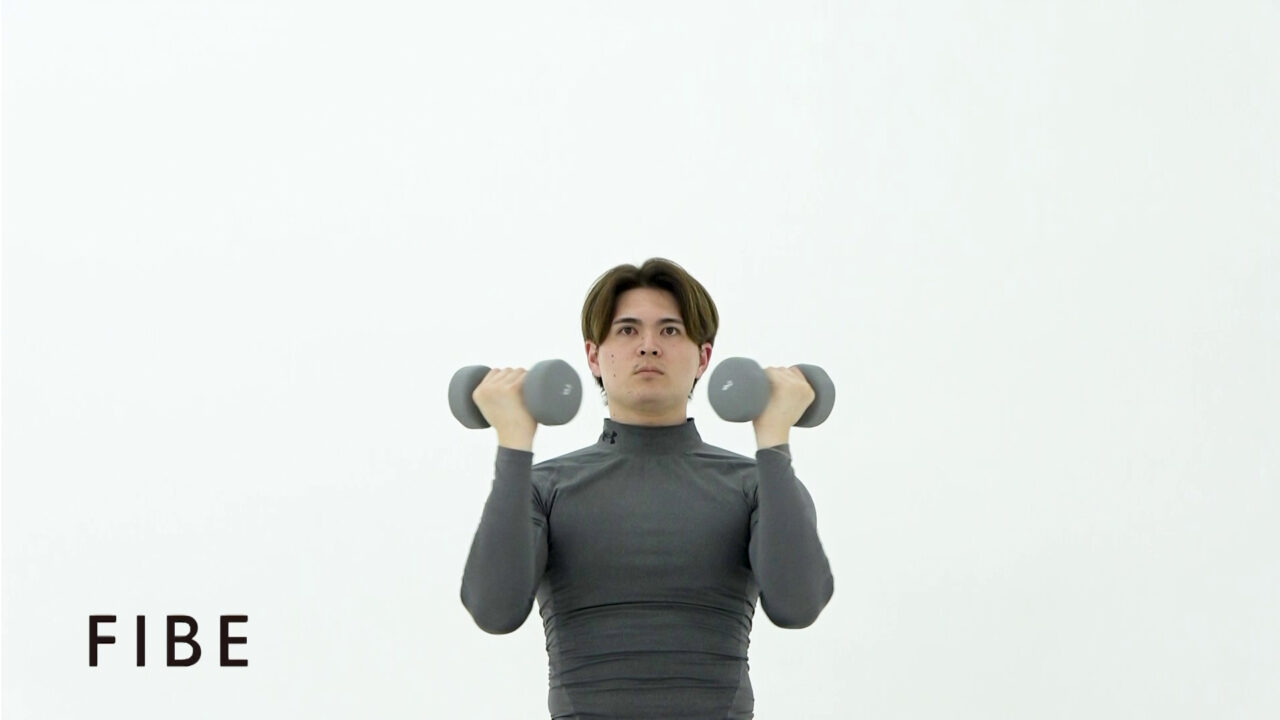 ベンチに座る(立位でも可)。手のひらを自分に向けダンベルを胸前で構える(肘は前)。