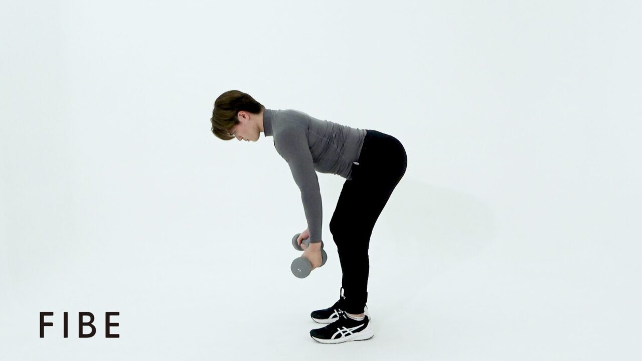 股関節を折りヒンジ姿勢を保ちながら肘を体側に沿わせて引く動作で、背中の筋群が総合的に働きます。姿勢改善や肩甲骨の可動向上にも効果的です。