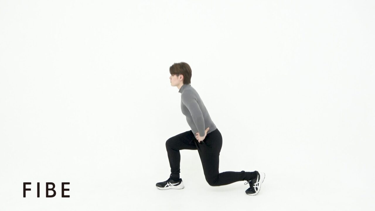 前後に脚を開いて上下に動く片脚トレーニングで、前脚の大腿四頭筋・大臀筋を主動とし骨盤の安定を促します。体幹も働き、全身のバランス能力を高めます。